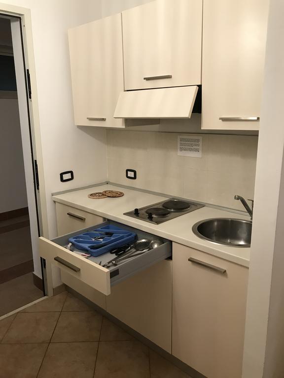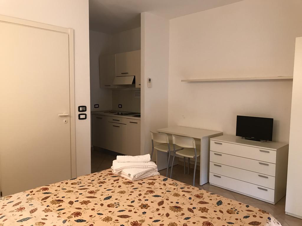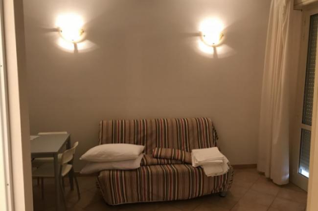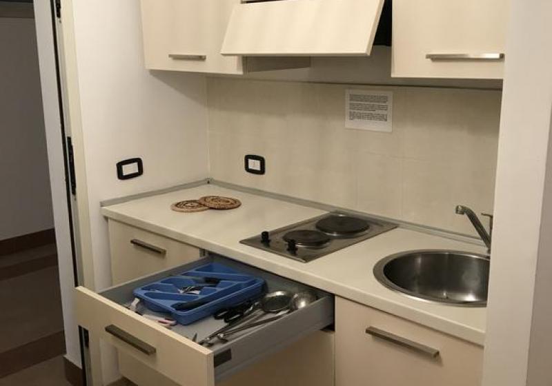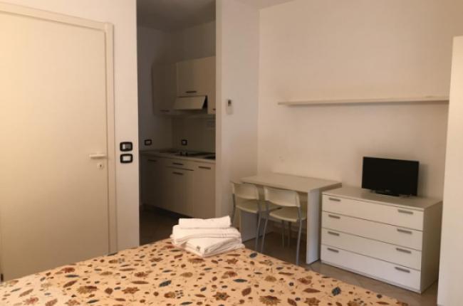 Descrizione appartamenti monolocali: angolo cottura attrezzato e camera in un unico ambiente ( climatizzatore caldo / freddo e TV a colori), bagno con doccia + asciugacapelli e finestra, terrazza con tavolo e sedie + lavabo per esterni.
