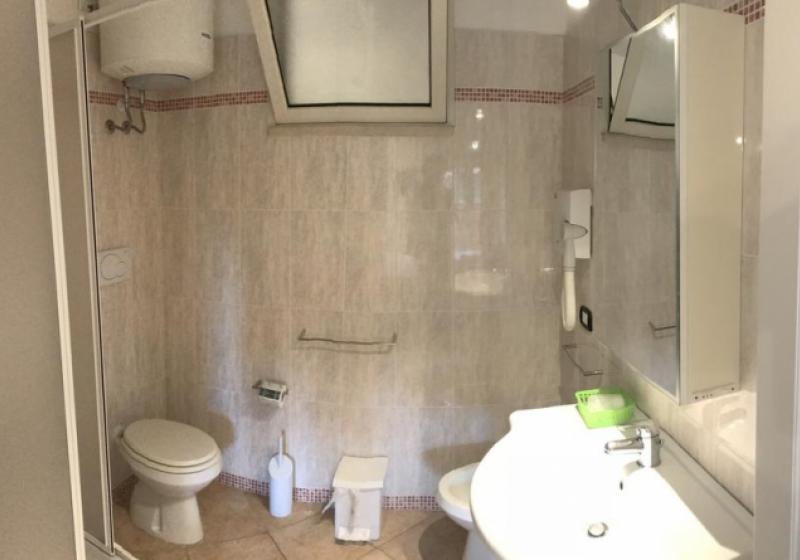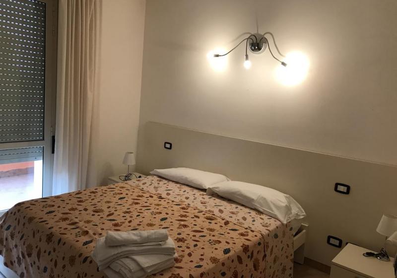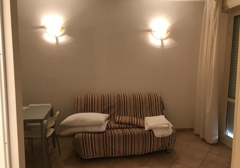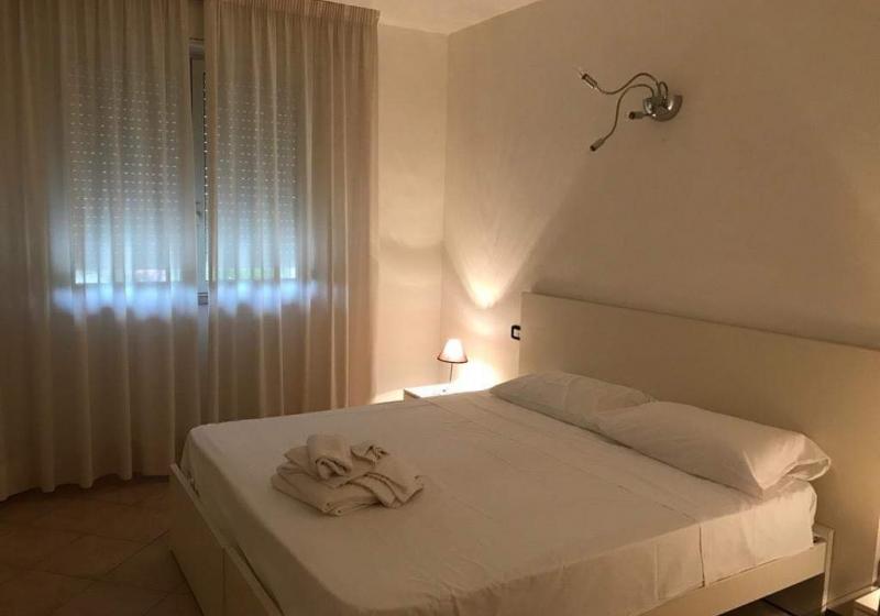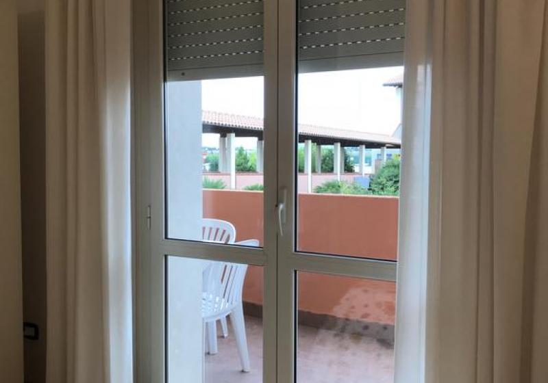 Descrizione appartamenti bilocali: soggiorno con divano-letto matrimoniale ( climatizzatore caldo / freddo e TV a colori), angolo cottura attrezzato in vano separato con finestra, disimpegno tra reparto giorno e reparto notte, camera matrimoniale ( climatizzatore caldo / freddo), bagno con doccia + asciugacapelli e finestra, terrazza (o veranda + giardino) attrezzata con tavolo e sedie + lavabo per esterni.